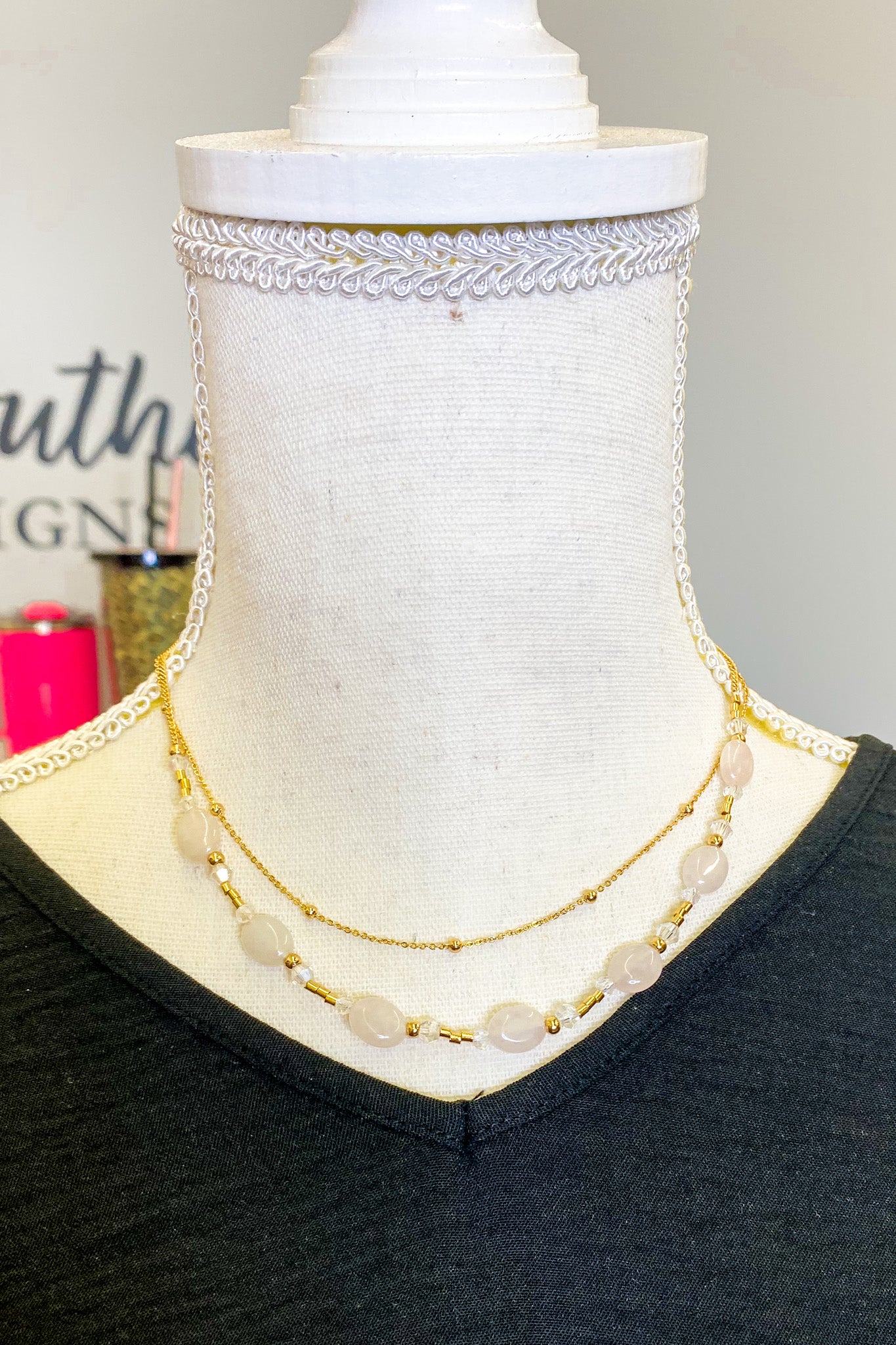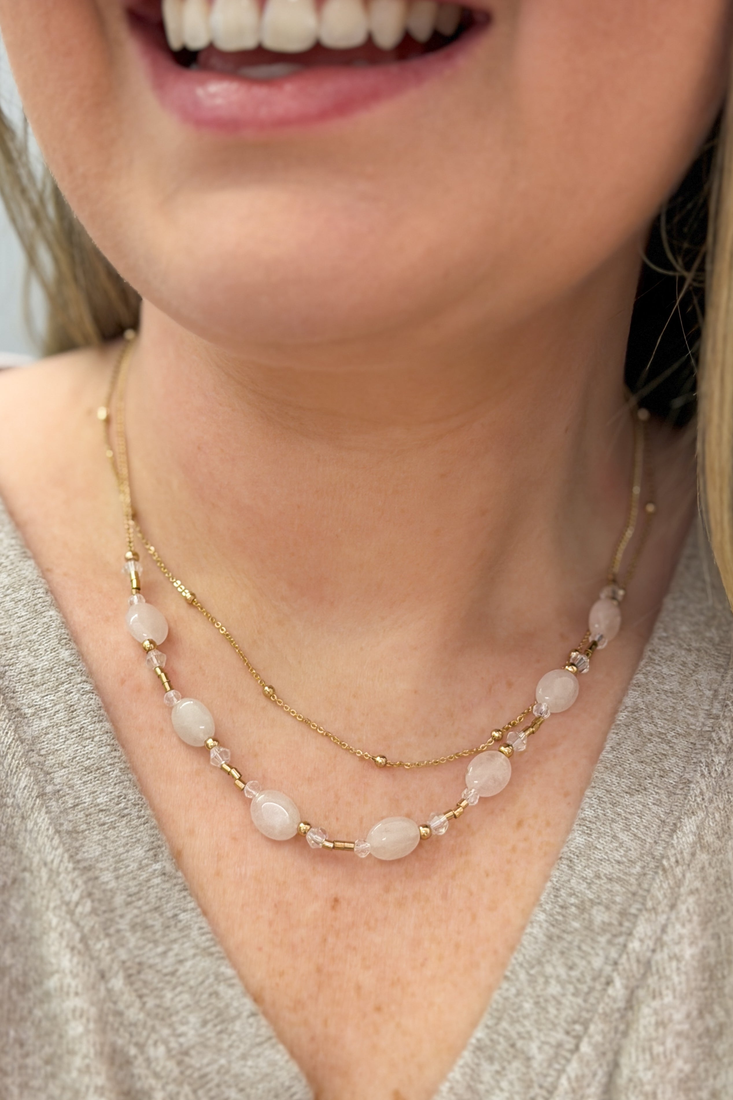 Layered Chain Link Necklace, Rose Quartz