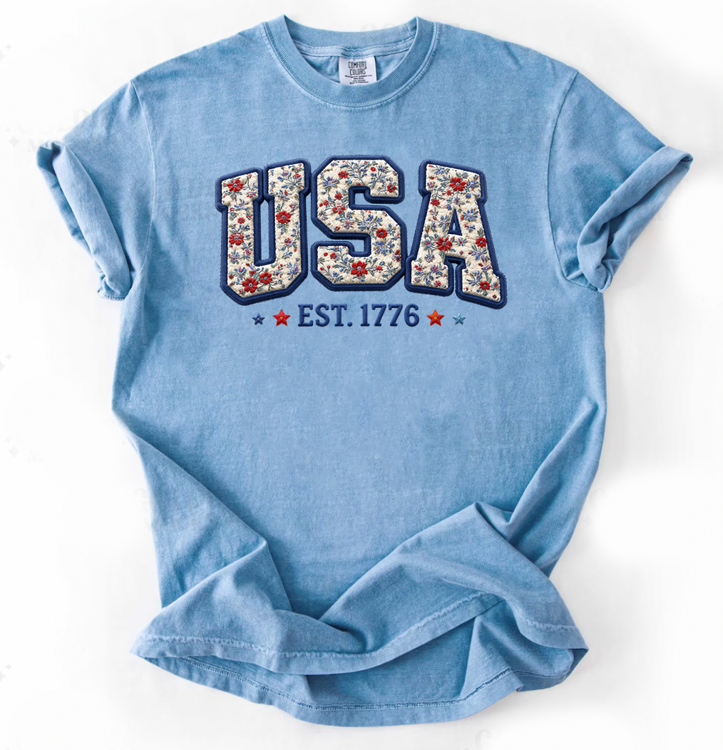 PREORDER: USA Faux Floral Patch Graphic Tee, Washed Denim