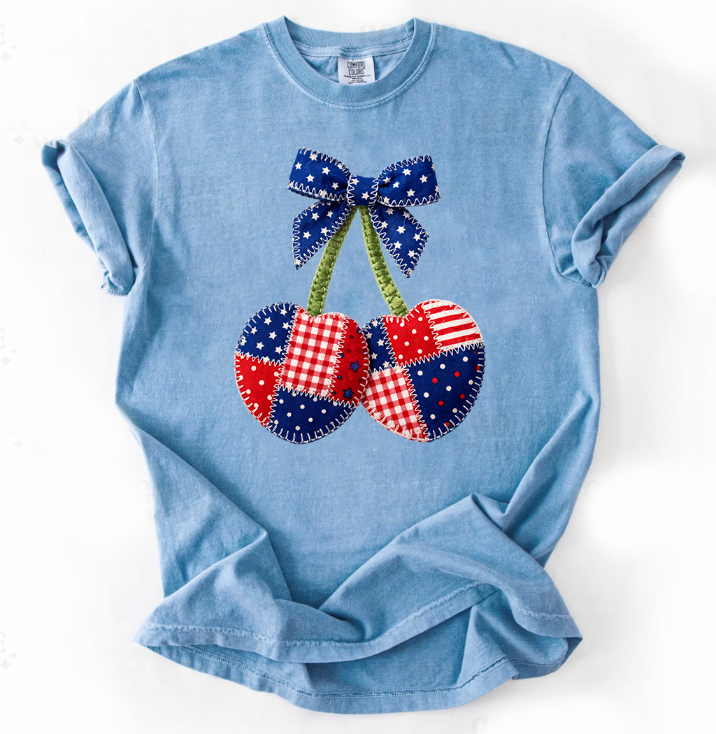 PREORDER: Faux Patchwork Patriotic Cherry Graphic Tee, Washed Denim