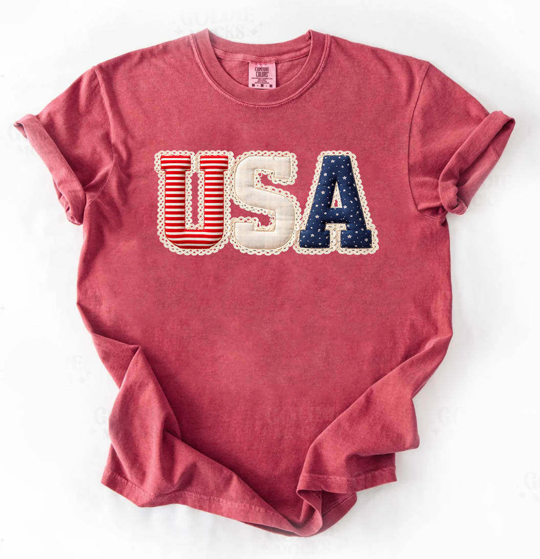 PREORDER: USA Faux Floral Patch Graphic Tee, Crimson